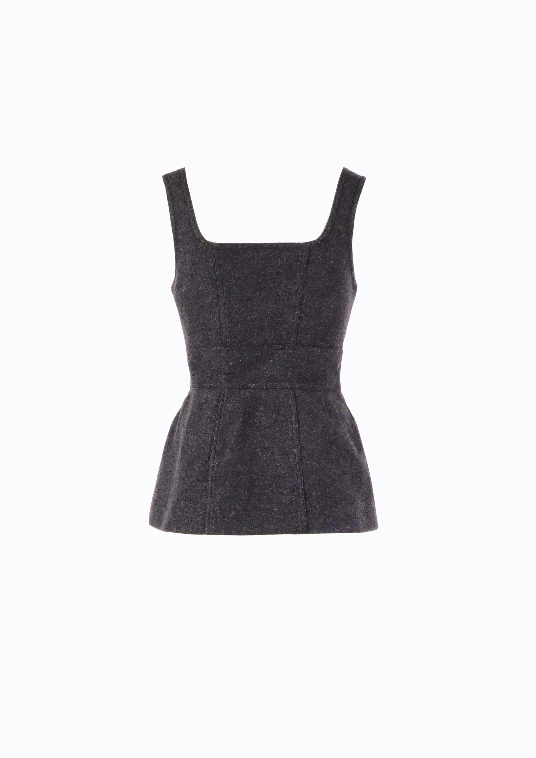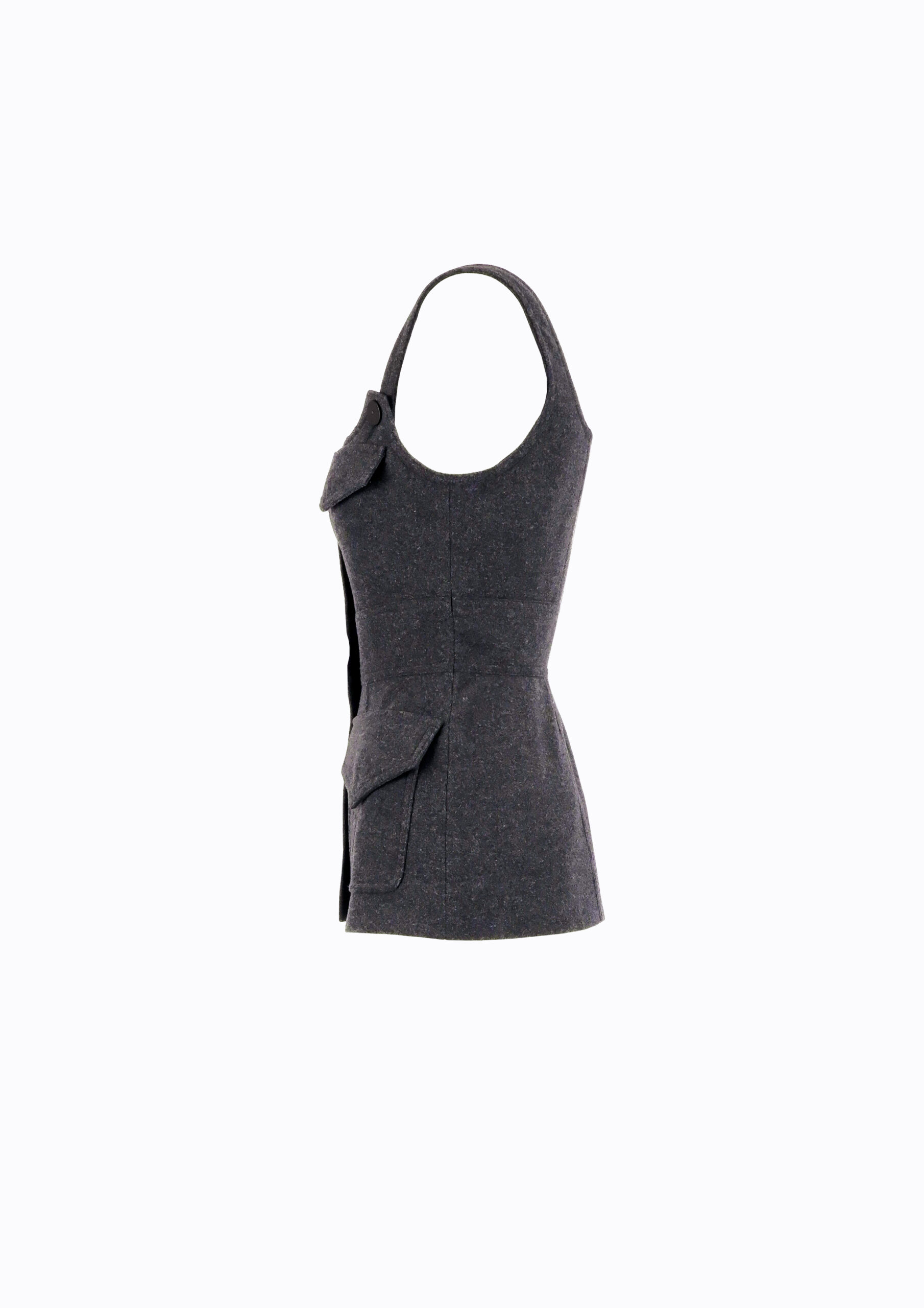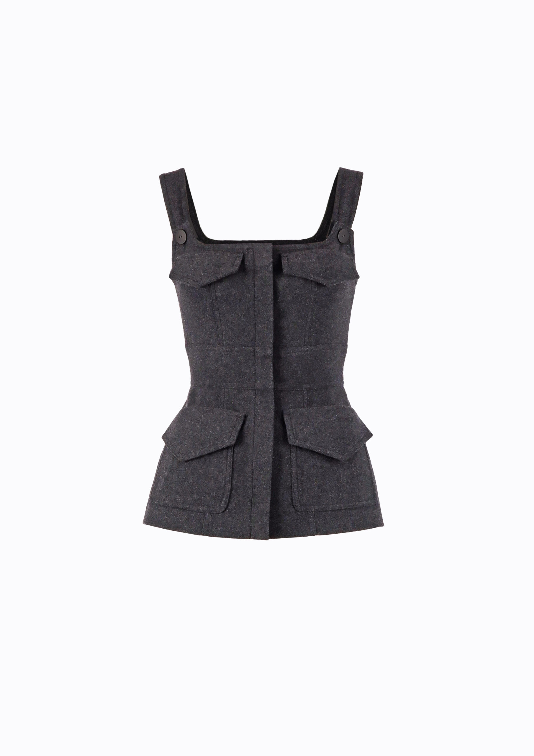 Įliemenuota liemenė su kvadratine iškirpte, plačiomis petnešomis ir kišenėmis su atvartais. Struktūriškas, šiuolaikiškas drabužis.