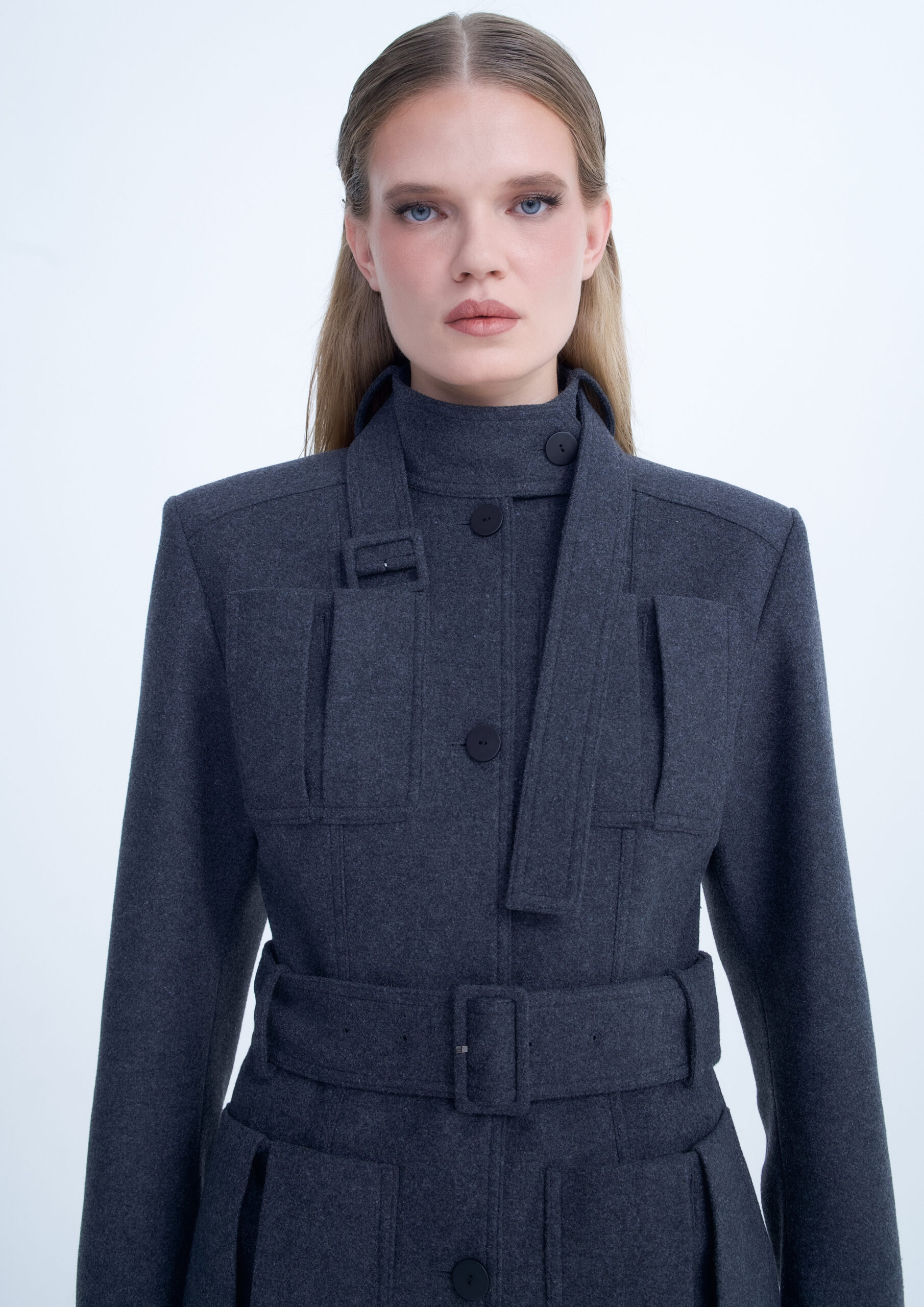 Modernus prigludusio silueto švarkas su kišenėmis priekyje ir reguliuojamais diržais ant liemens ir apykaklės.