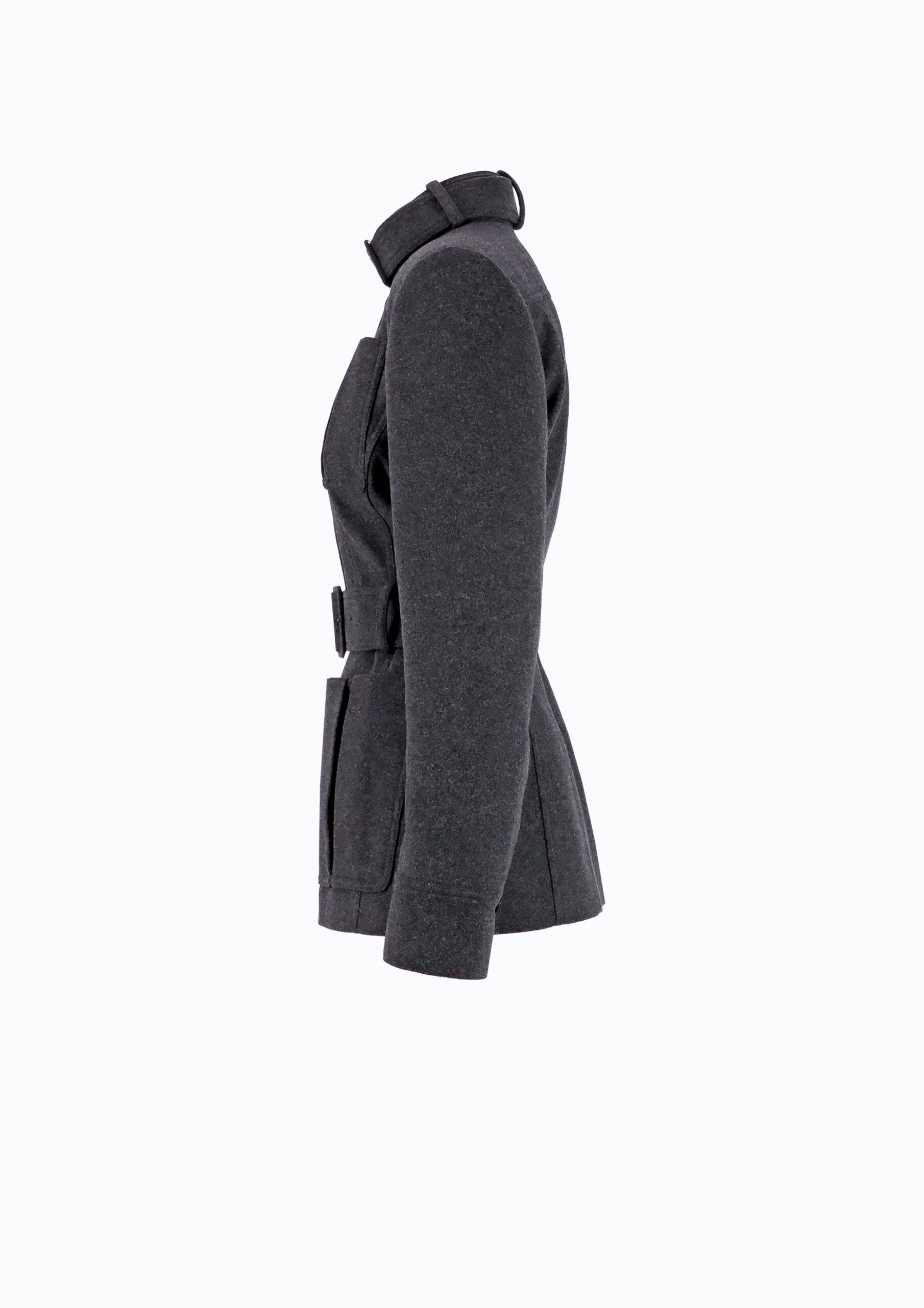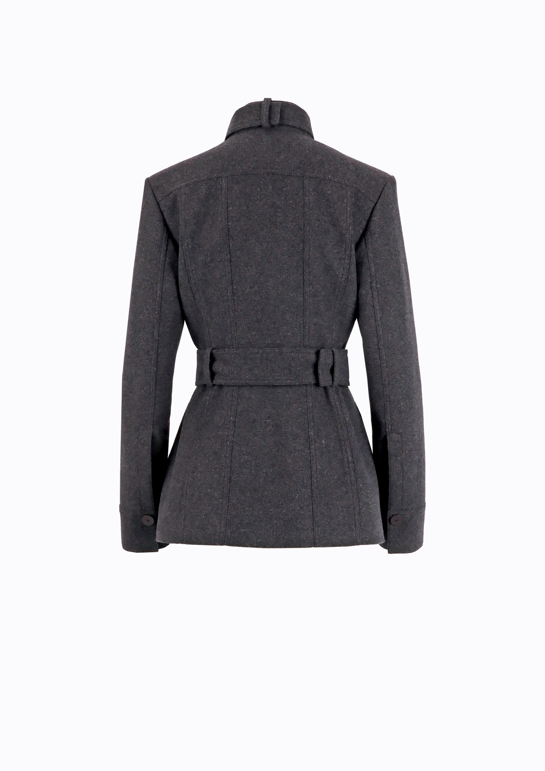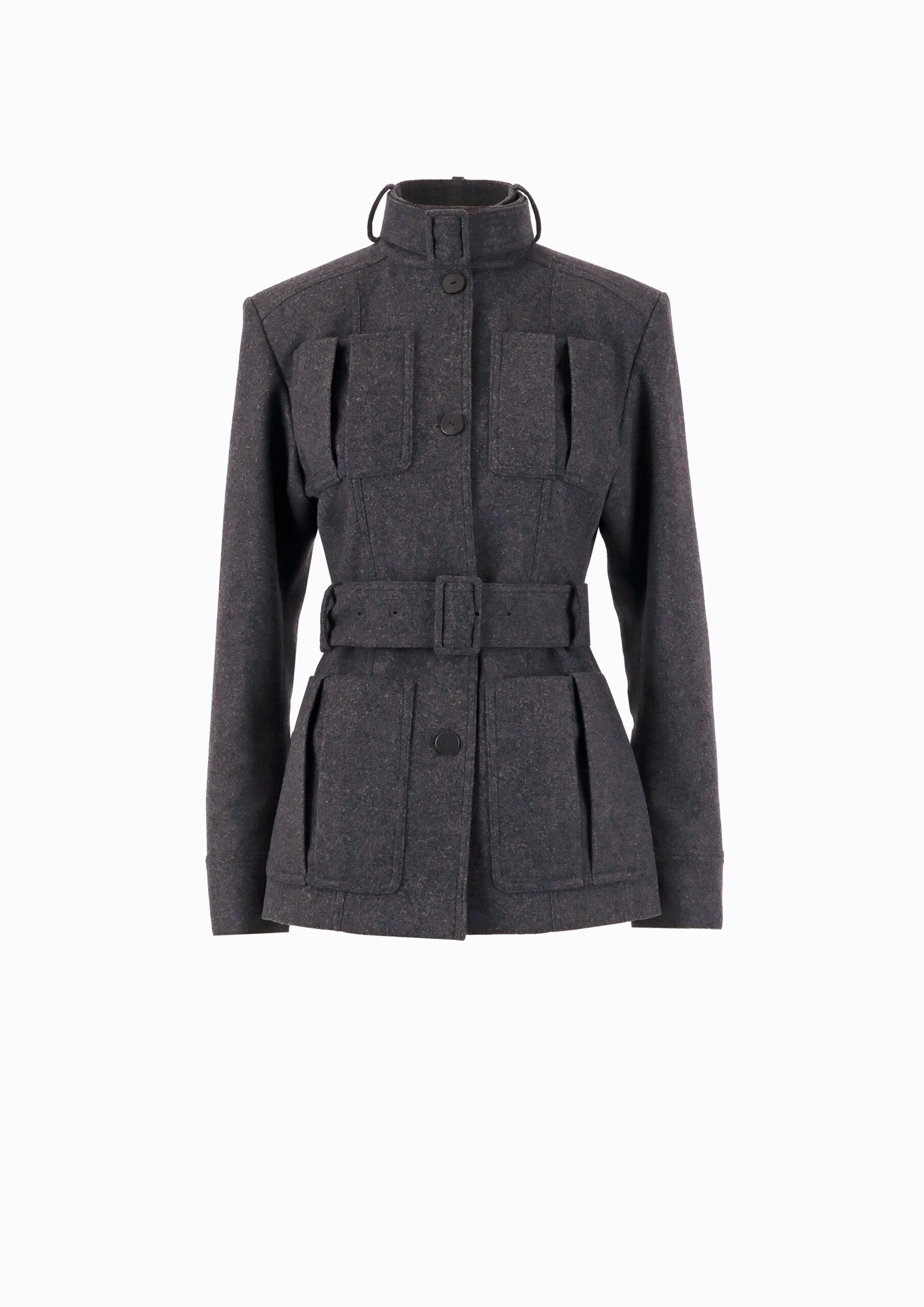 Modernus prigludusio silueto švarkas su kišenėmis priekyje ir reguliuojamais diržais ant liemens ir apykaklės.