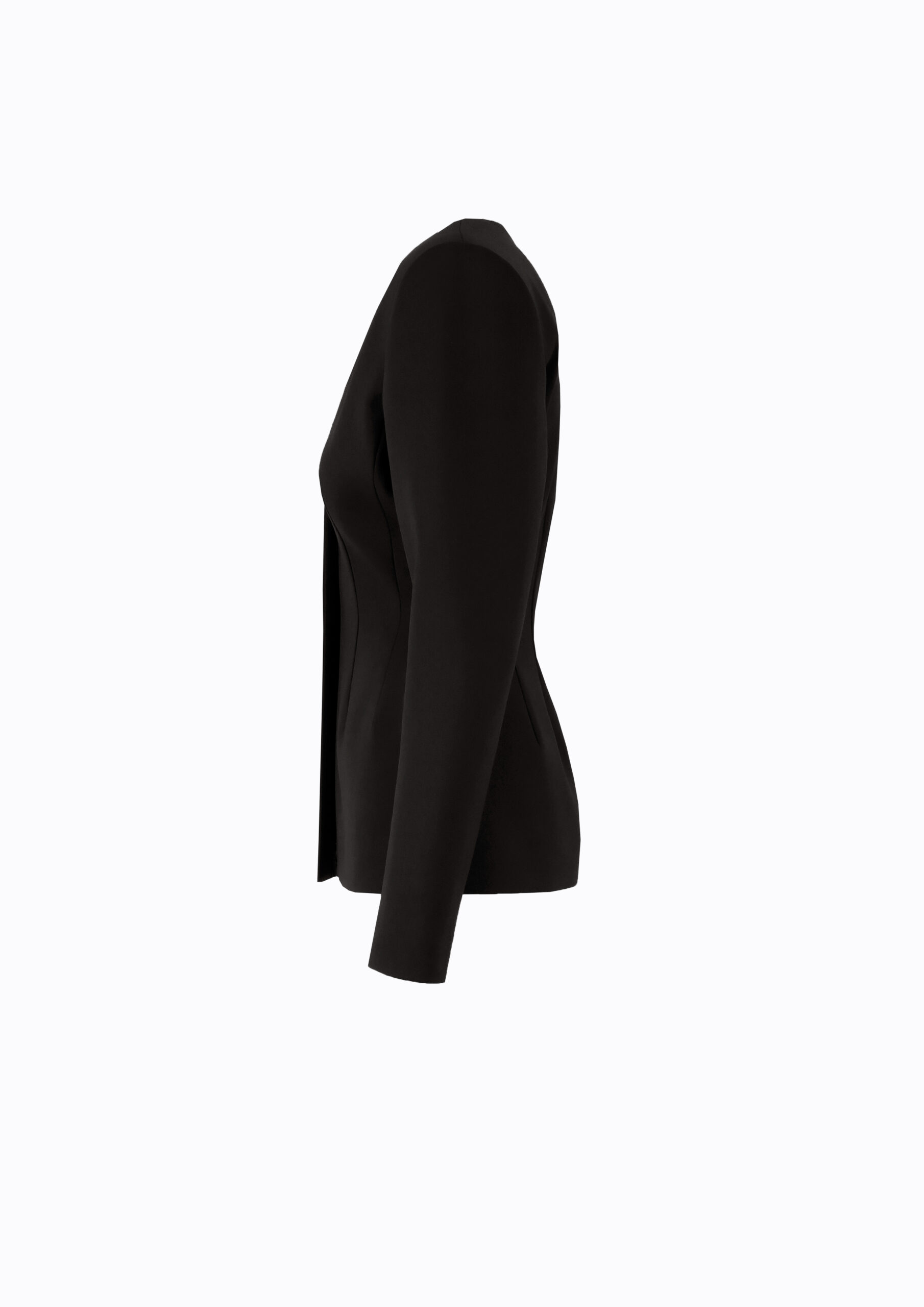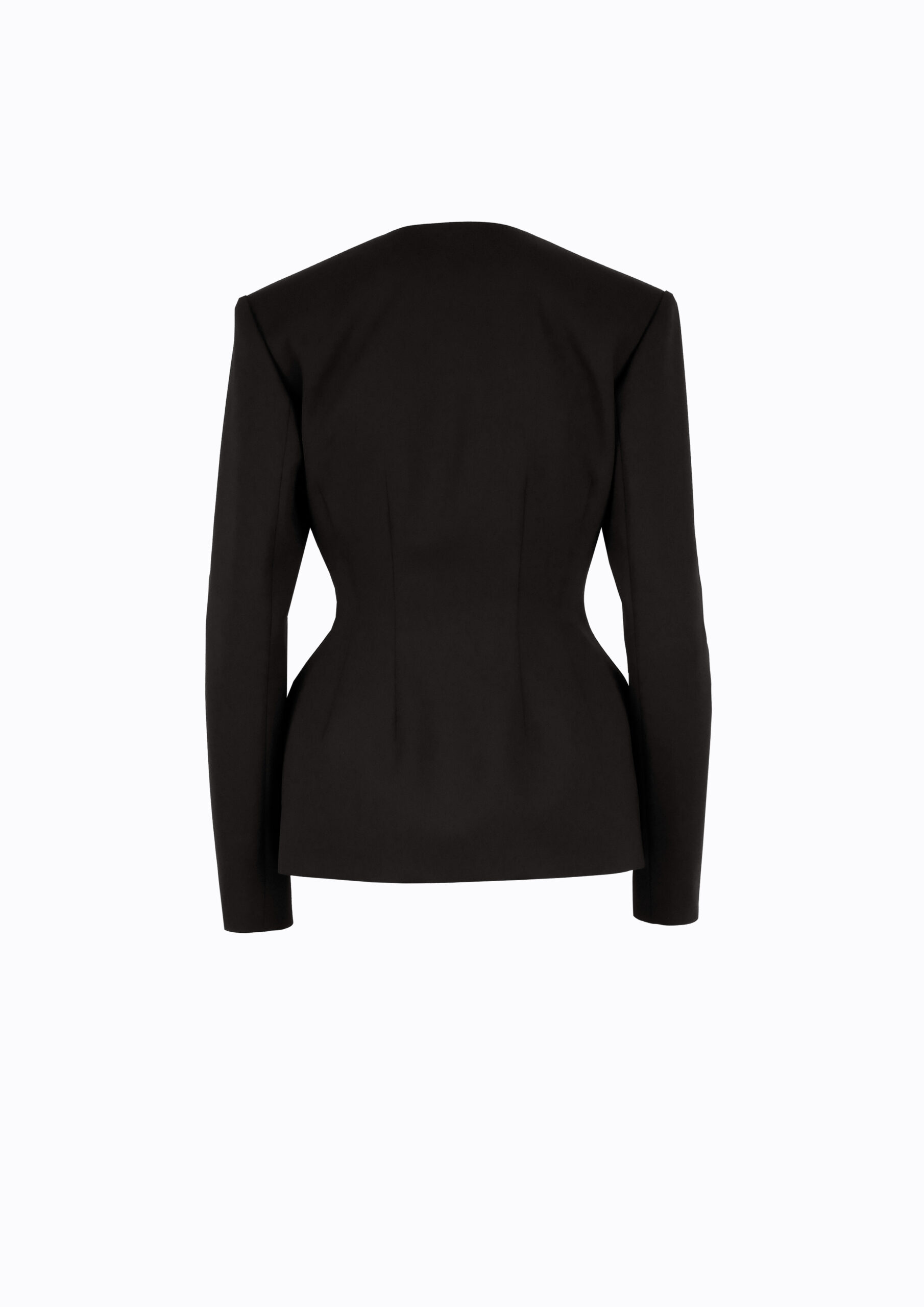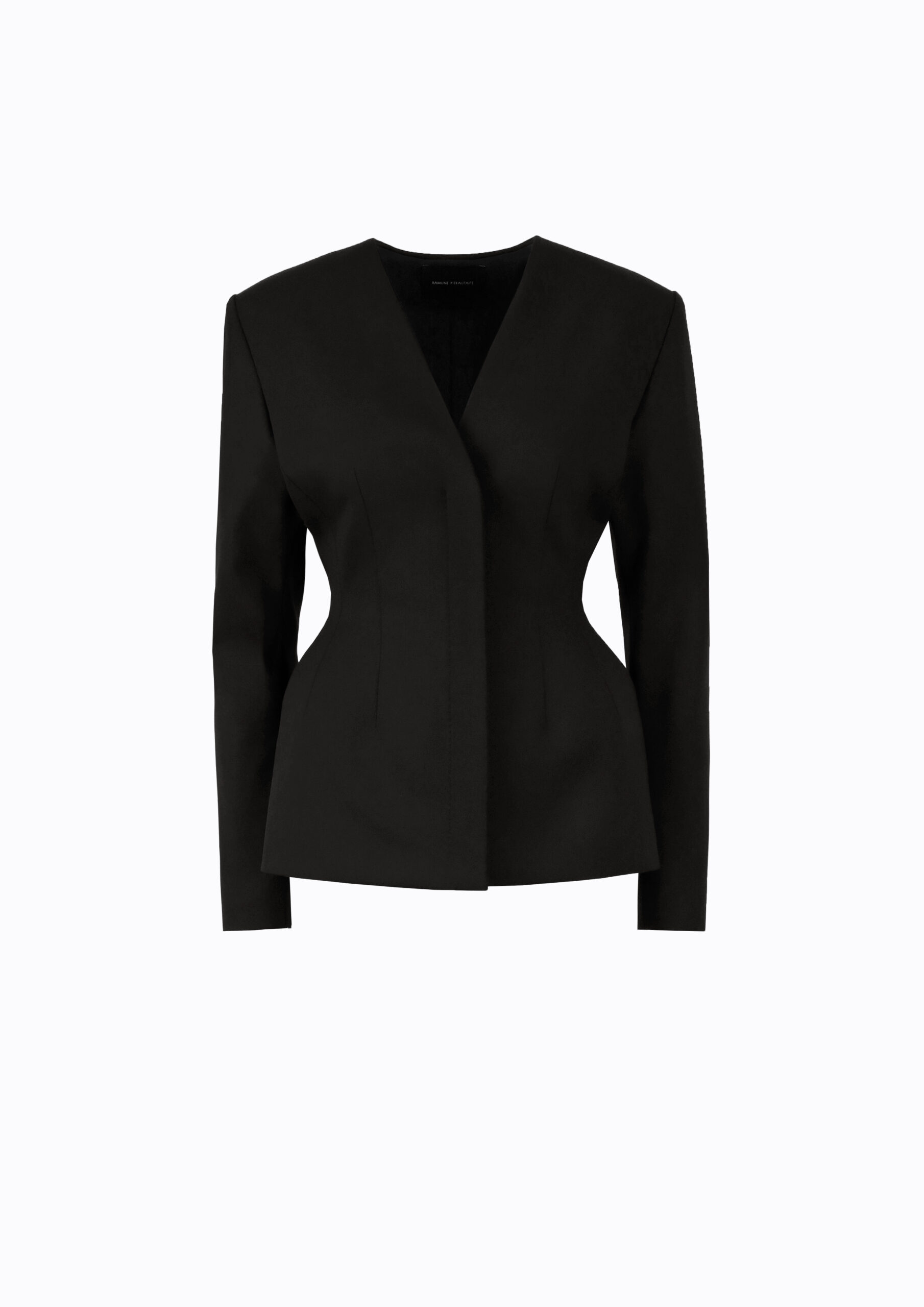 Stipriai įliemenuotas švarkas su gilia V-formos iškirpte, ryškiai išformuotu liemeniu ir pakietintomis šoninėmis detalėmis, kurios sukuria išryškintų klubų iliuziją. Galima derinti su to pačio audinio siaurėjančiomis kelnėmis.
