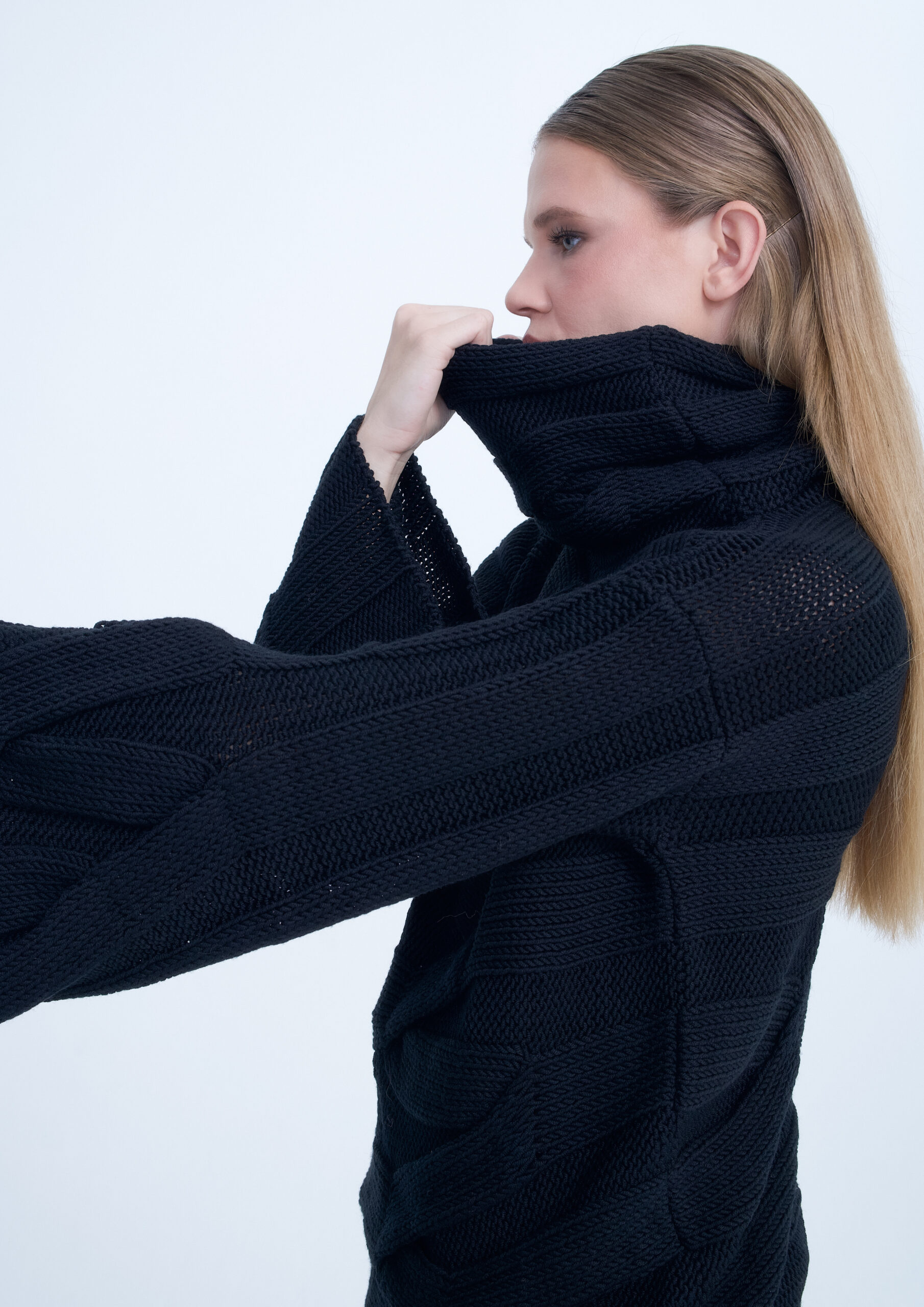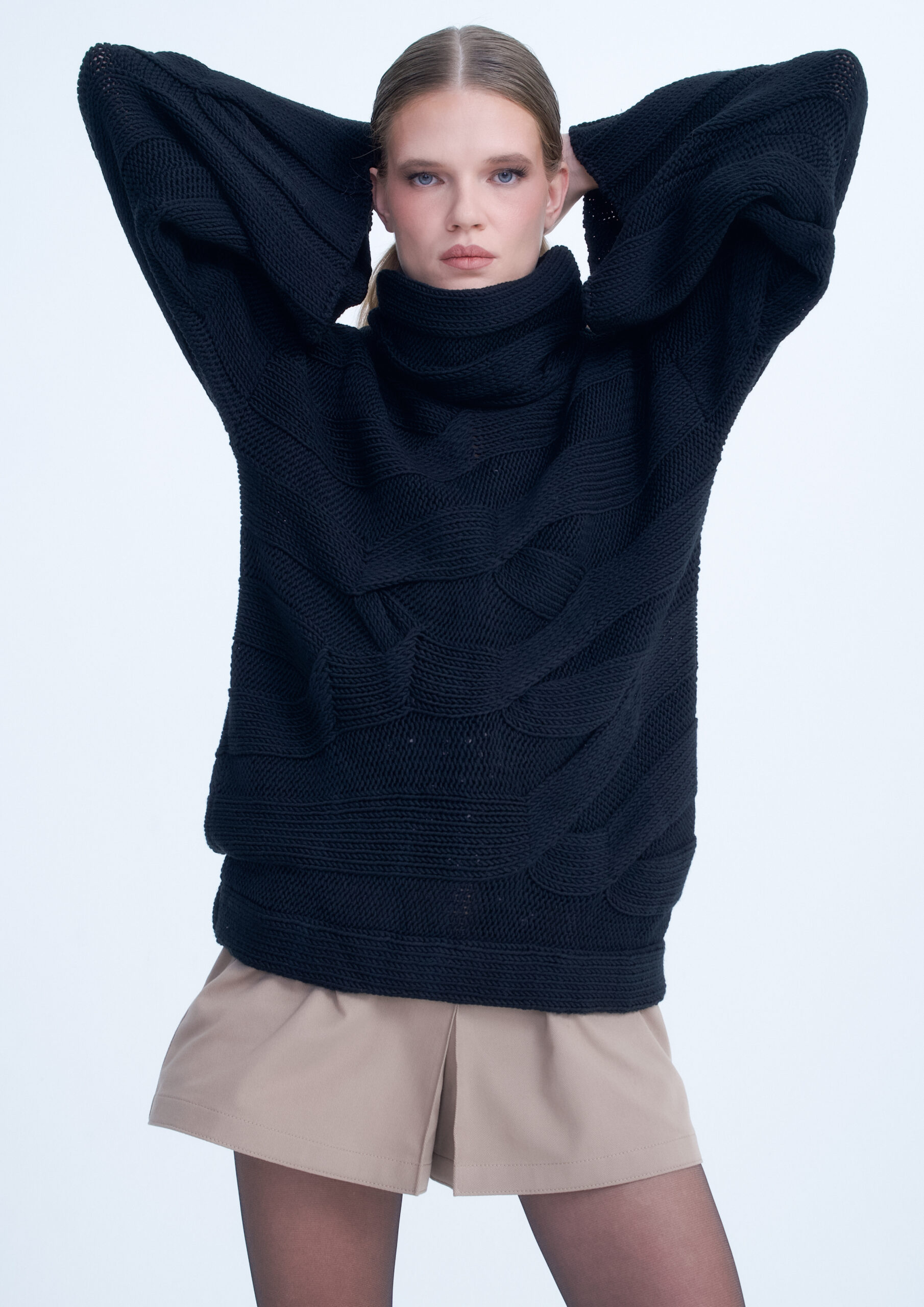 Platus, juodas megztinis su plačiomis rankovėmis ir aukštu kaklu. Megztas iš minkštų siūlų, unikaliu raštu. Puikiai tinka stilingam ir jaukiam įvaizdžiui.