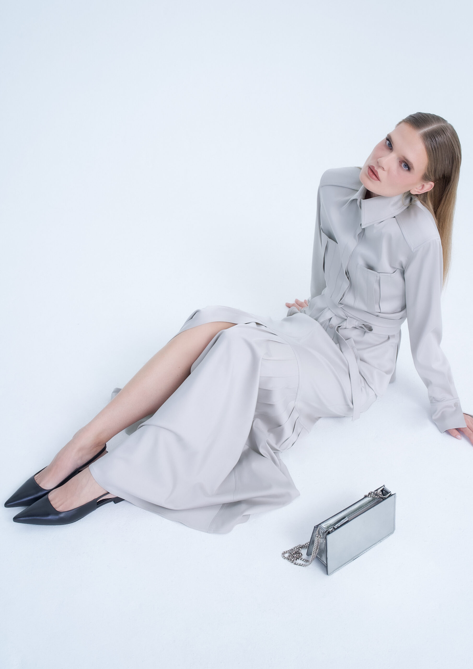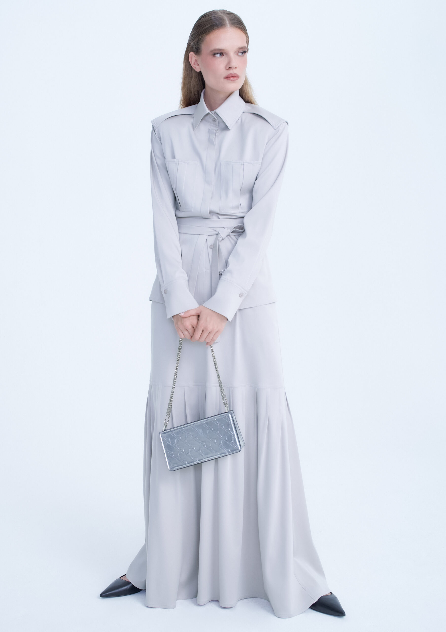 Elegantiškas, ilgas, satino sijonas, šviesiai pilkos spalvos. Pasižymi aukštu juosmeniu ir subtiliomis klostėmis, kurios pereina į grakštų siluetą. Puikiai dera su satino marškiniais – sukuria rafinuotą, suderintą įvaizdį.