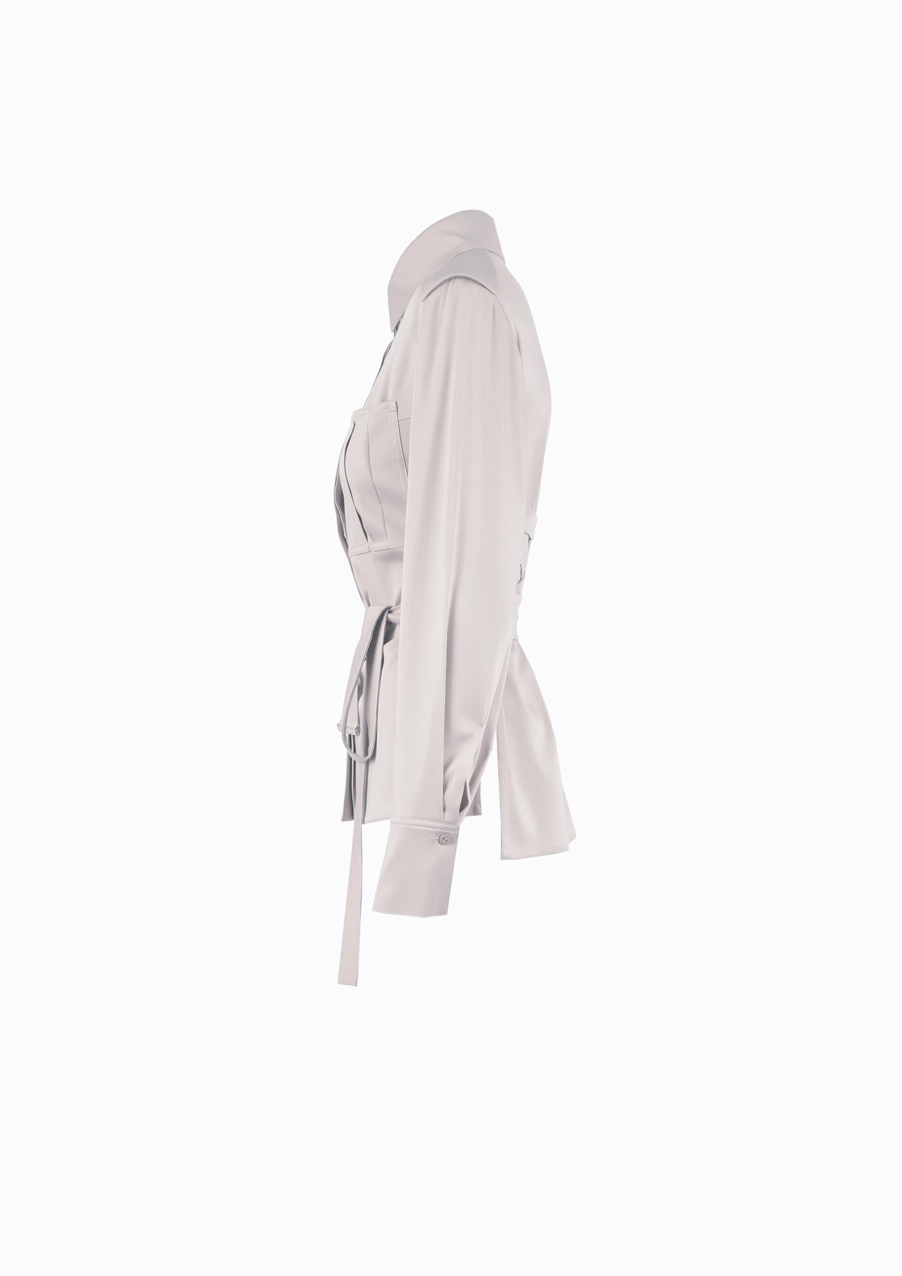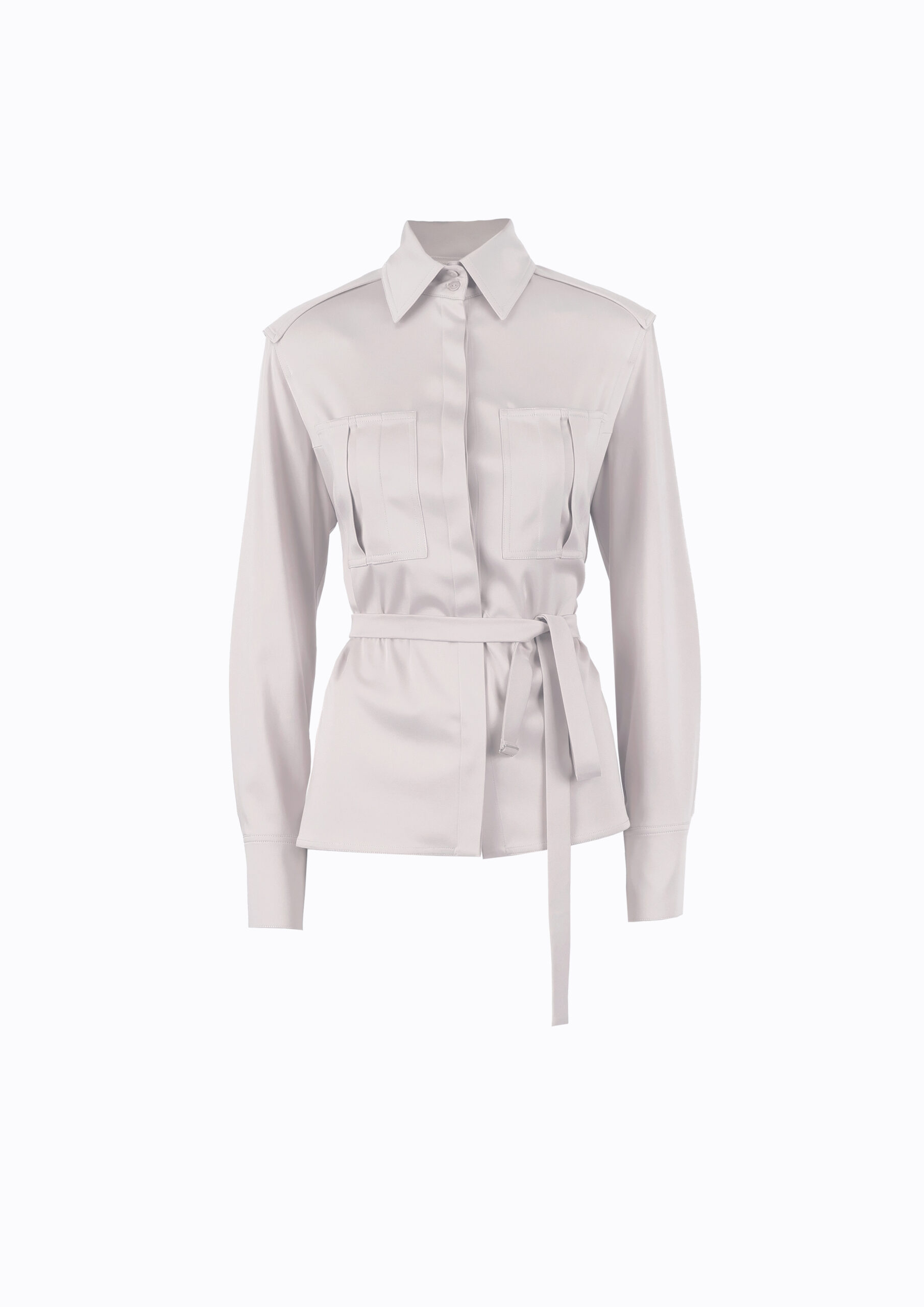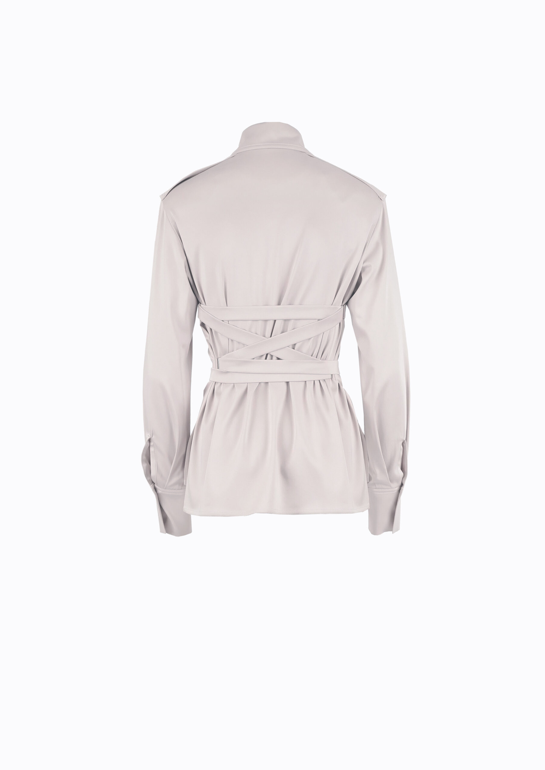 Elegantiški, satino marškiniai, šviesiai pilkos spalvos, su ilgu kaspinu, kurį galima surišti nugaroje arba kelis kartus apsivynioti aplink liemenį ir surišti priekyje.