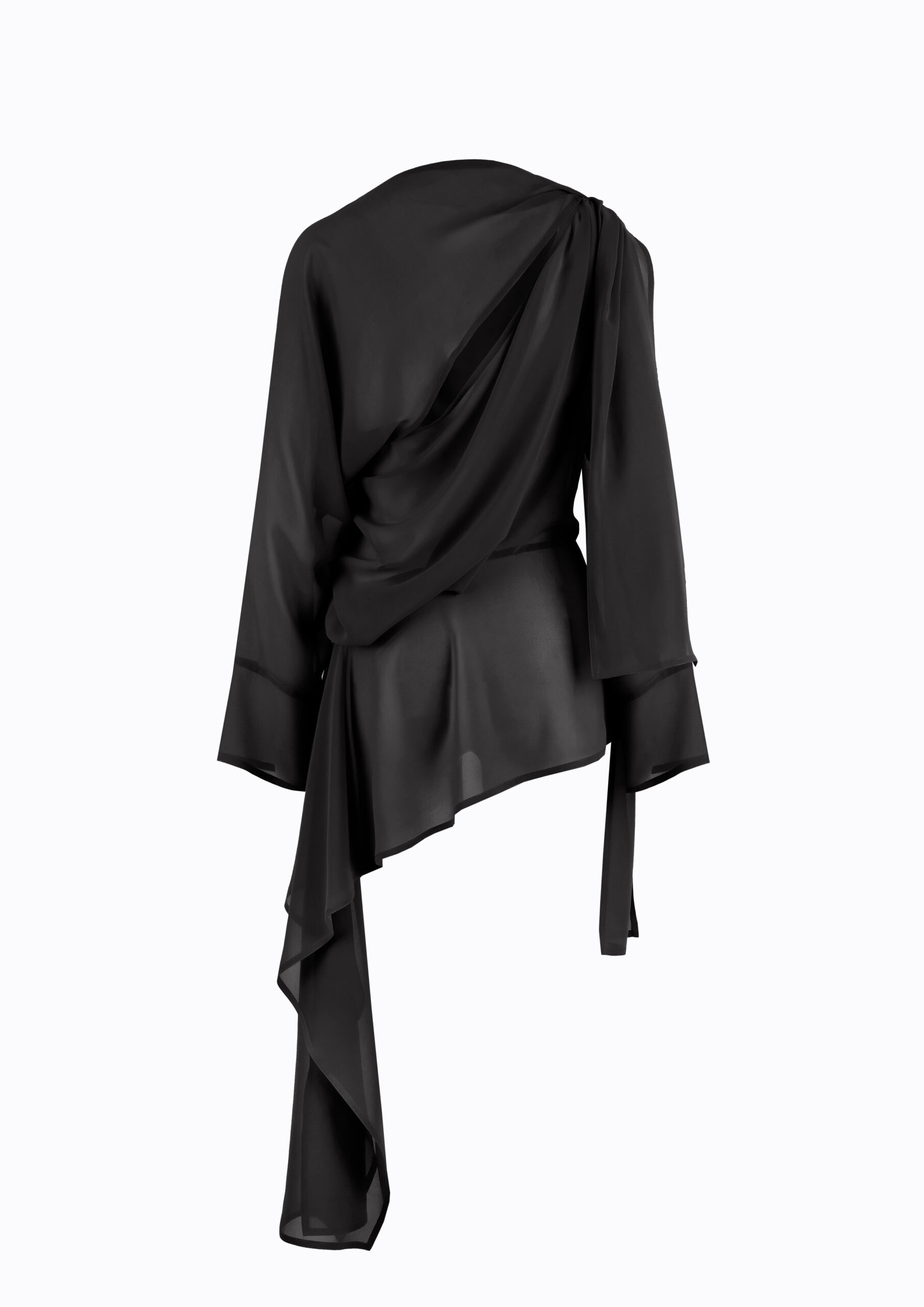 An elegant asymmetric blouse with a one-shoulder bow, soft side drape, and flowing scarf detail. Perfect for refined evening or occasion wear.
