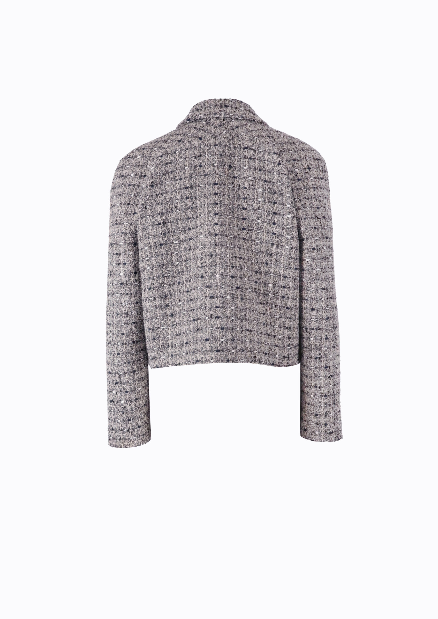 This jacket is made from soft, textured boucle fabric. The double-breasted piece features a structured silhouette and a modern cropped length for an elegant yet contemporary look.