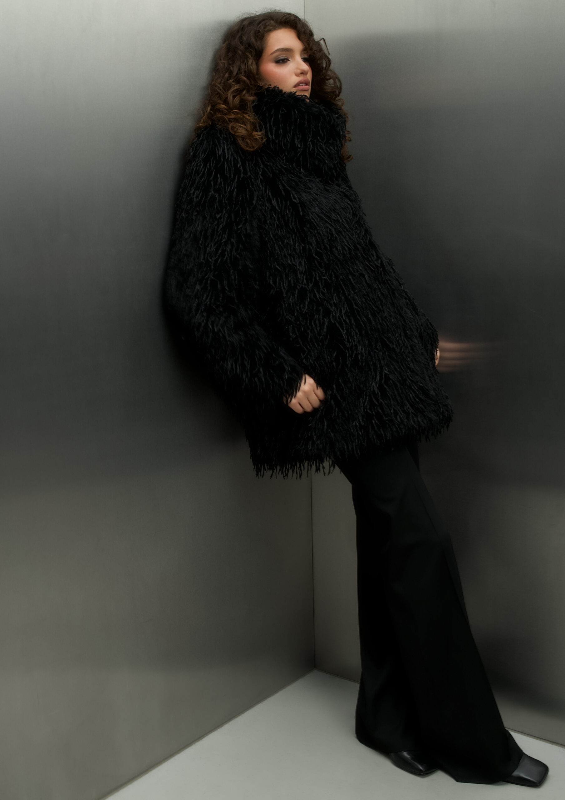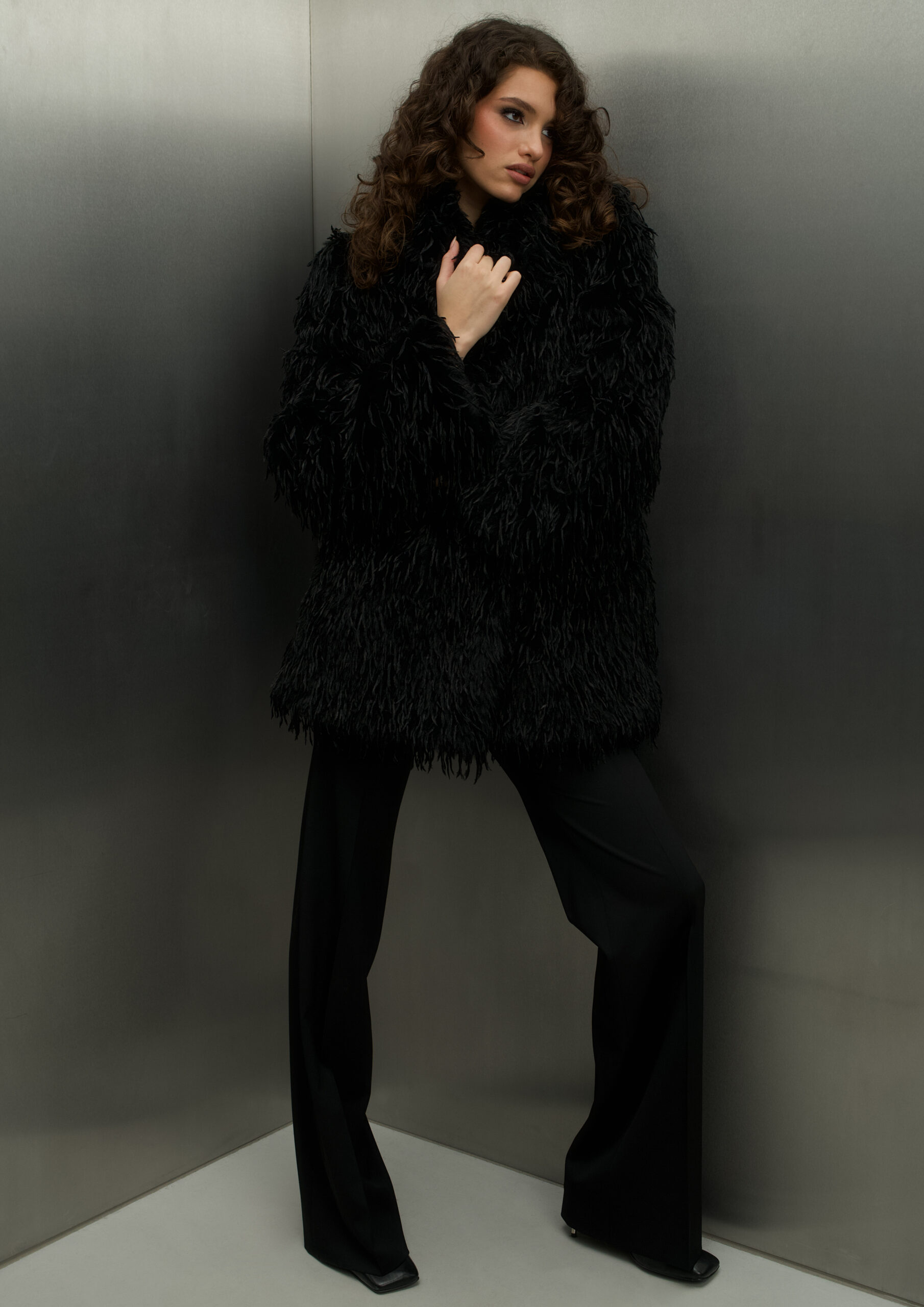 A black coat with a striking feather-effect texture, featuring long, soft, shaggy strands for a bold and voluminous look. Lightweight yet eye-catching, it adds instant statement style to any outfit.