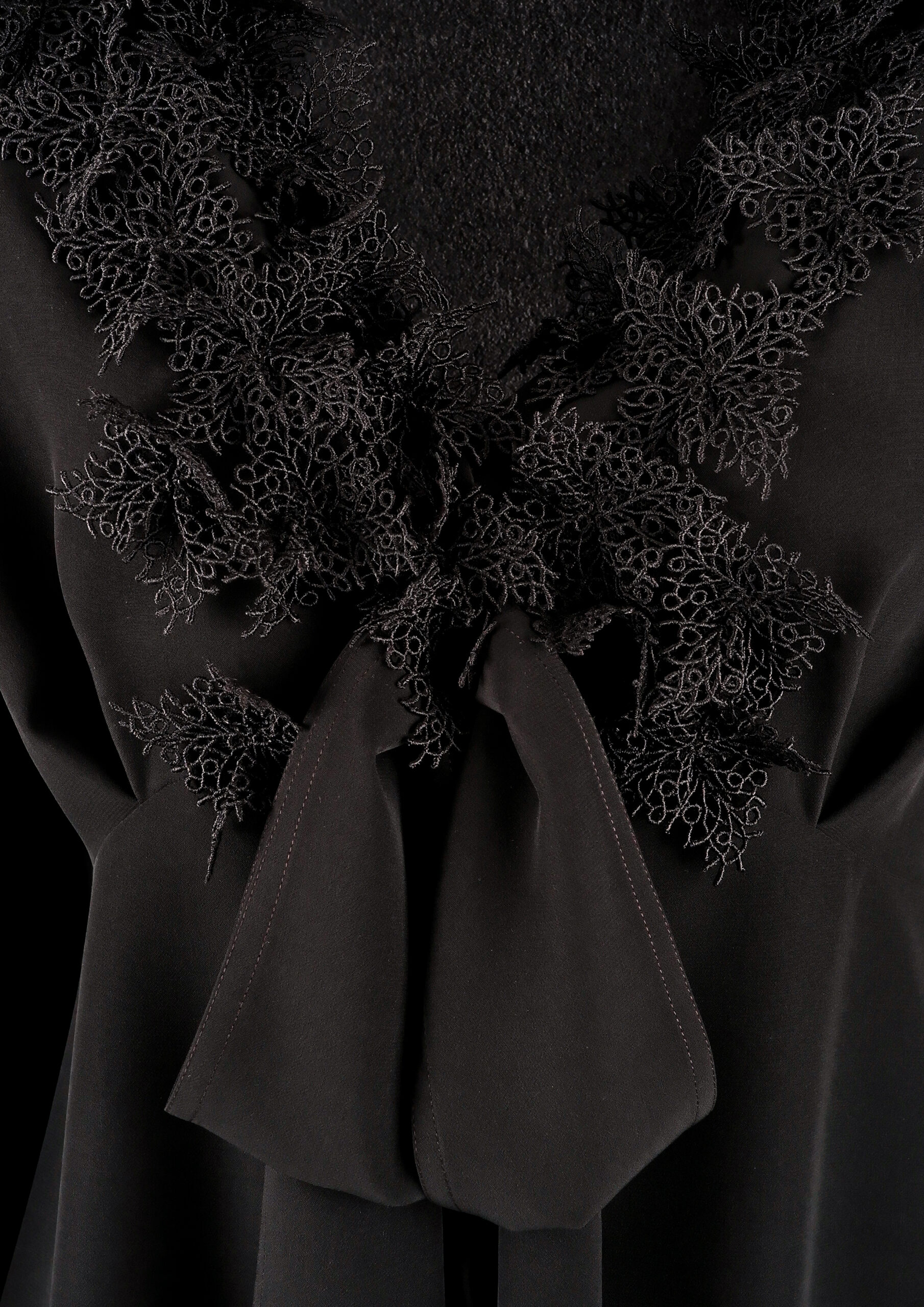 Elegant blouse featuring delicate lace accents and a flowing tie at the front. Designed with long sleeves and a refined silhouette, it offers a timeless, sophisticated look for both day and evening wear.