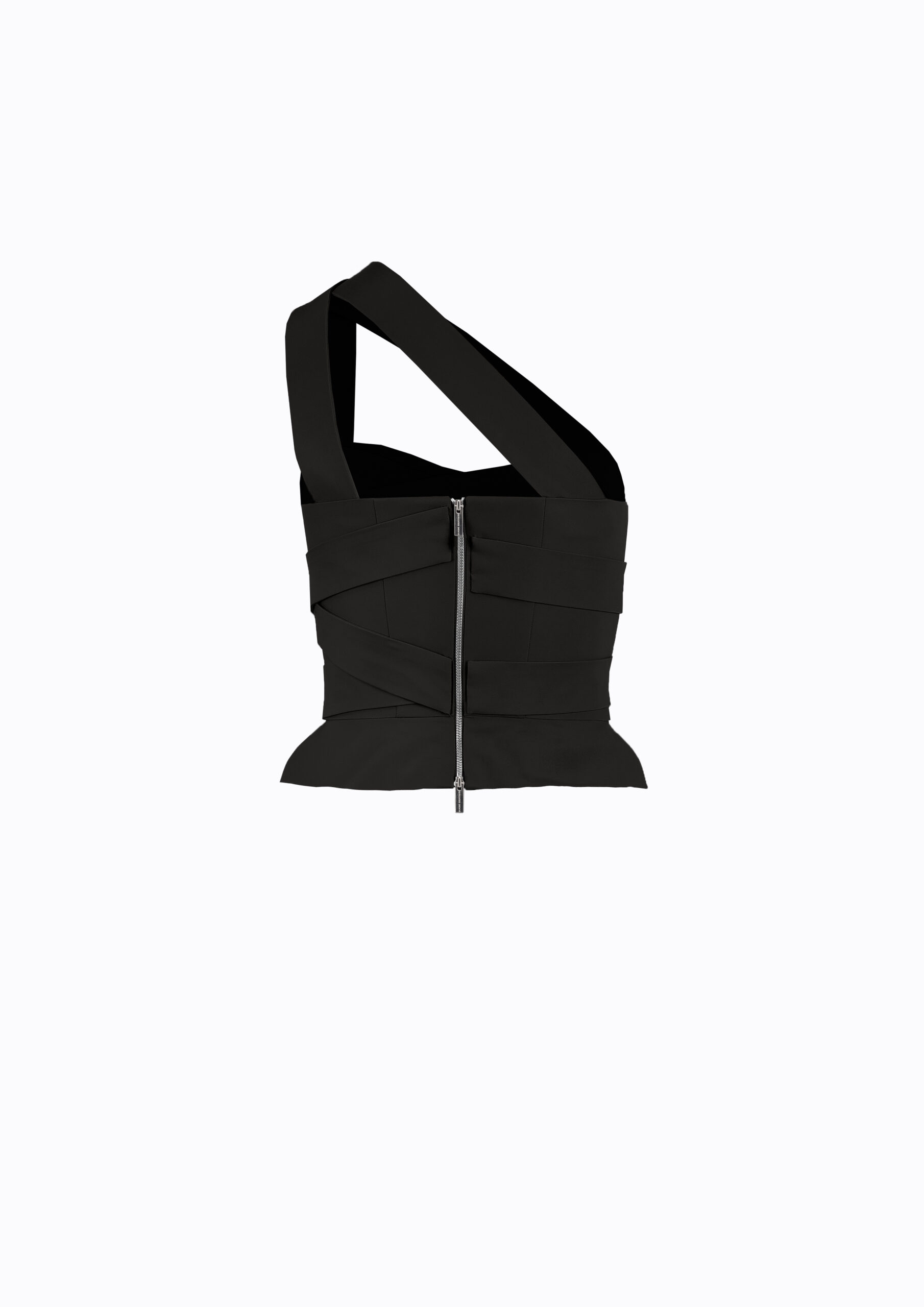 A modern long corset with an asymmetrical design. The structured silhouette and wide crossover straps create a bold and elegant look. Pairs perfectly with the wide-leg trousers and skirt from the collection.