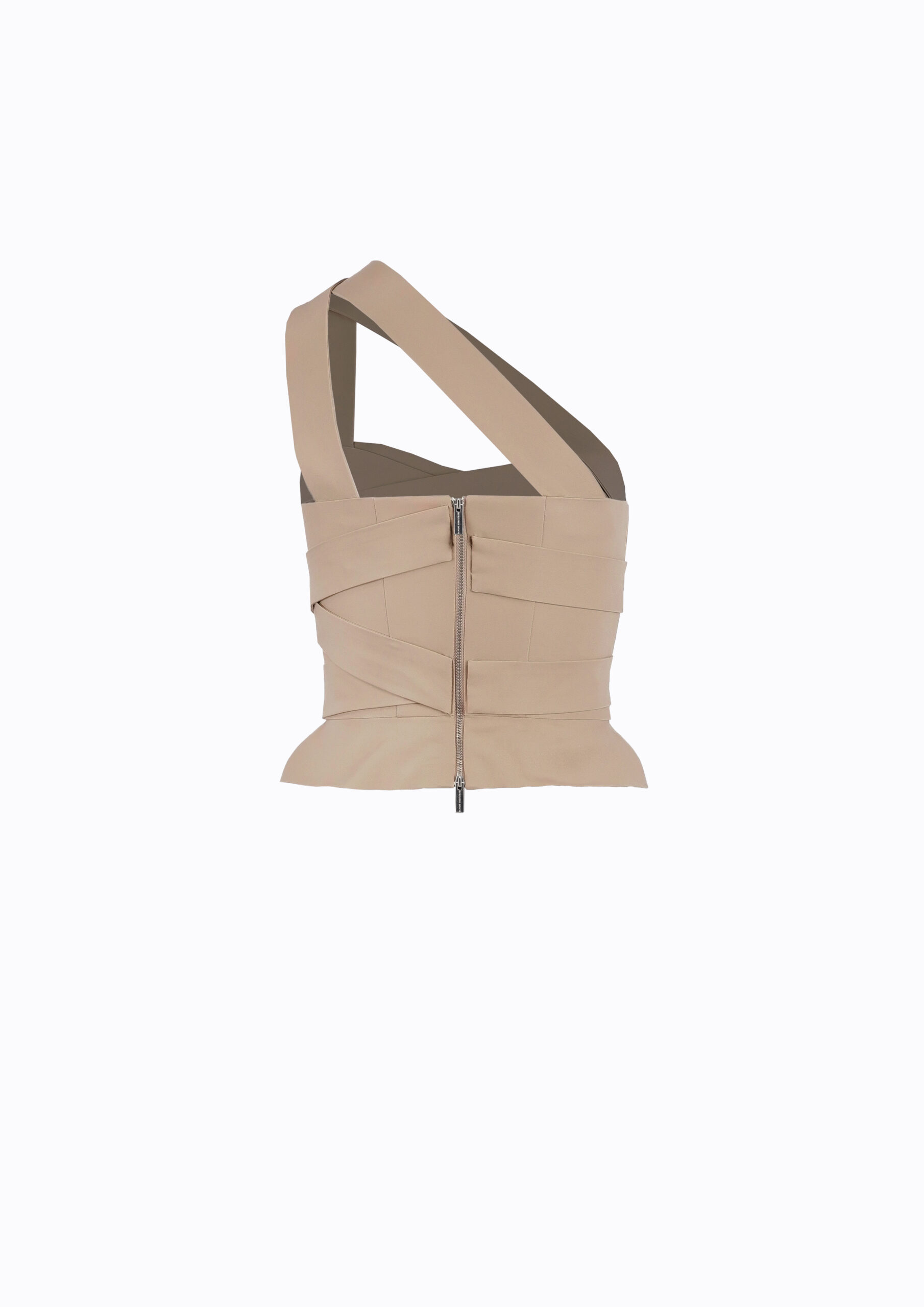 A modern long corset with an asymmetrical design. The structured silhouette and wide crossover straps create a bold and elegant look. Pairs perfectly with the wide-leg trousers and skirt from the collection.