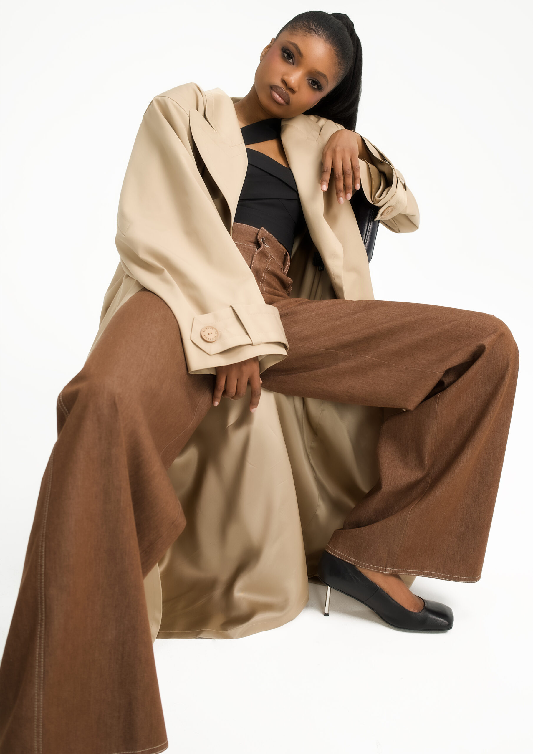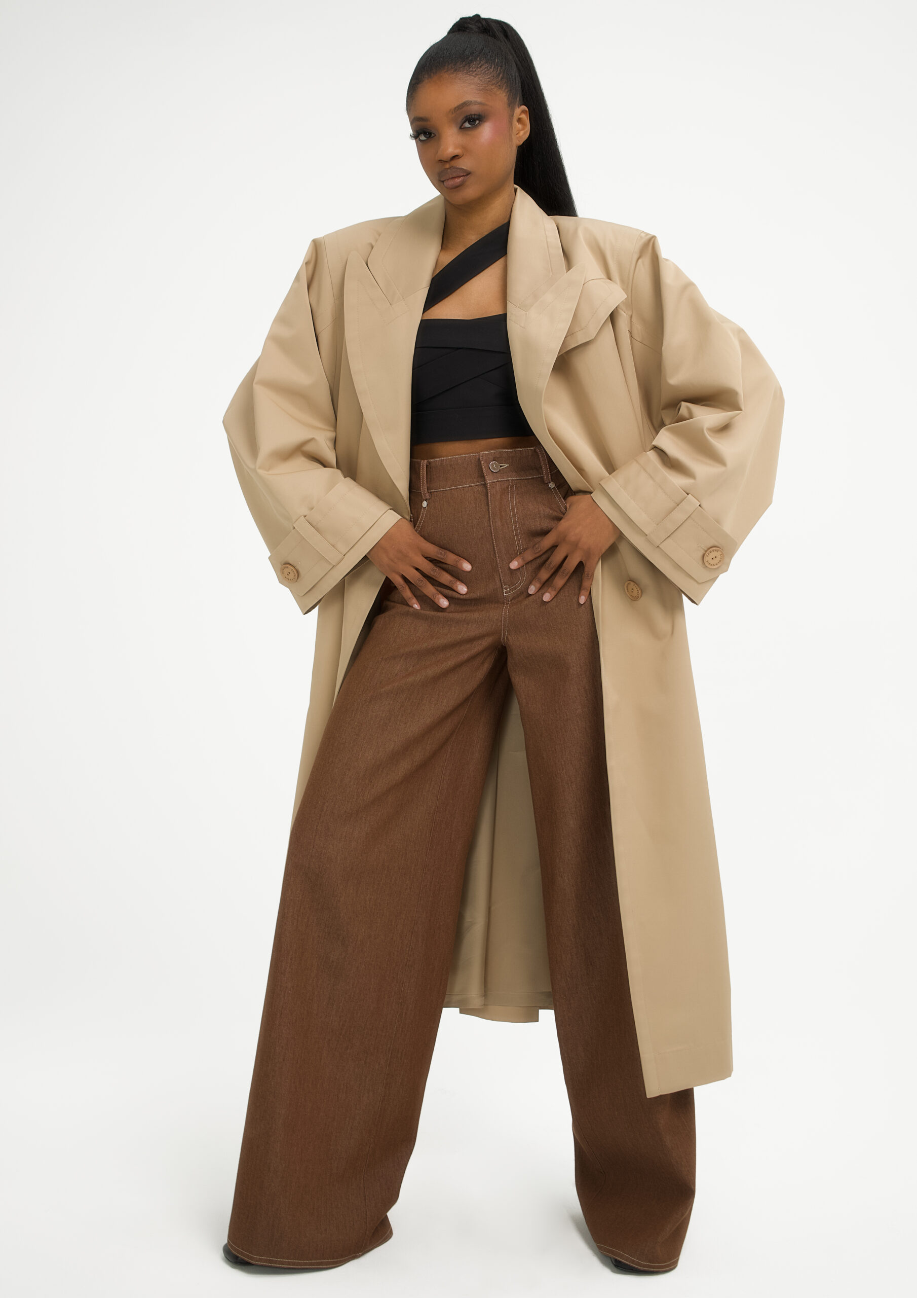 Oversized trench coat with wide shoulders and voluminous sleeves that can be worn loose or fastened with an additional button. Features an adjustable belt for a defined silhouette. Crafted from water-resistant, impregnated fabric.