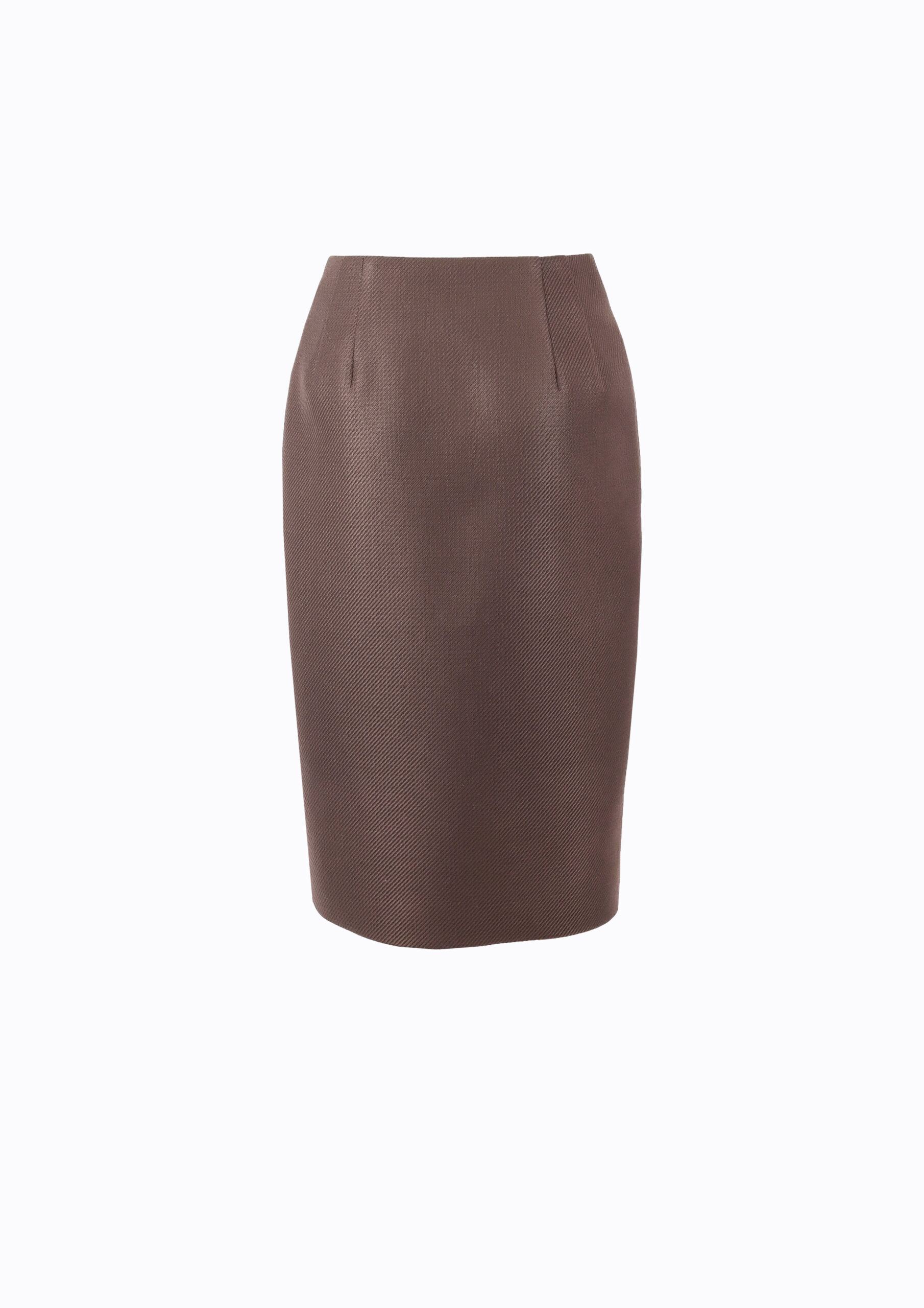 This skirt is made from a subtly shiny, textured fabric. It has a classic pencil silhouette with a clean design and a discreet front zipper detail.