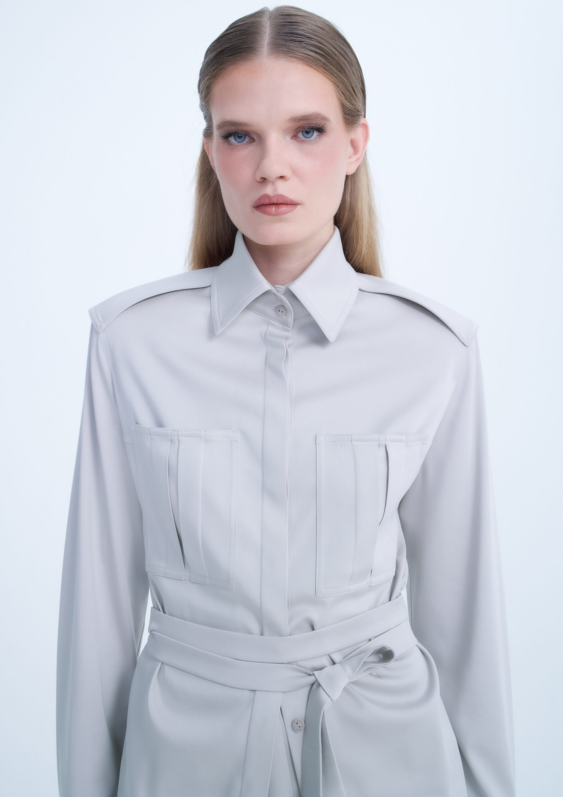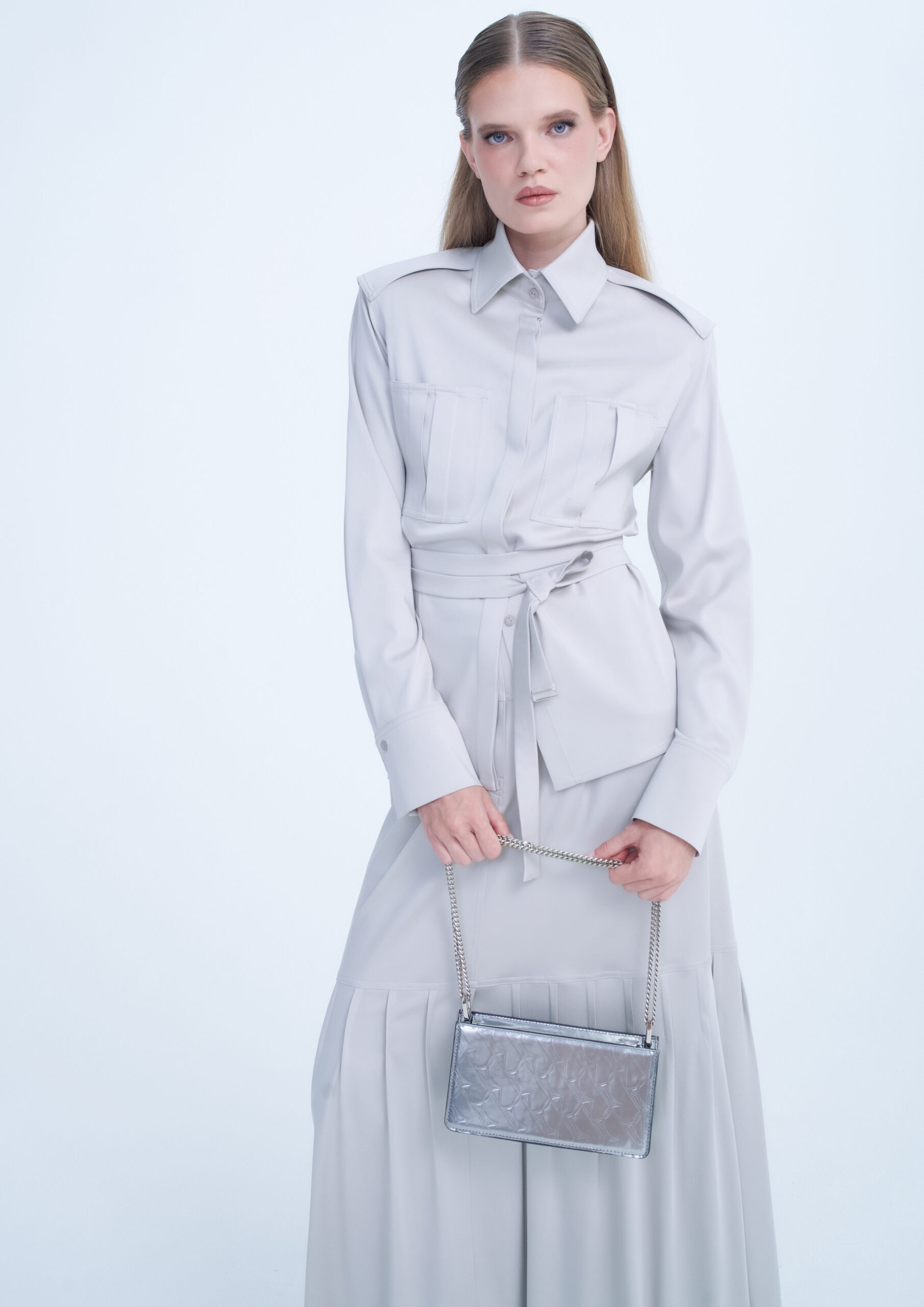 Elegant satin shirt in a light grey shade, featuring a long ribbon that can be tied at the back or wrapped around the waist and tied at the front.