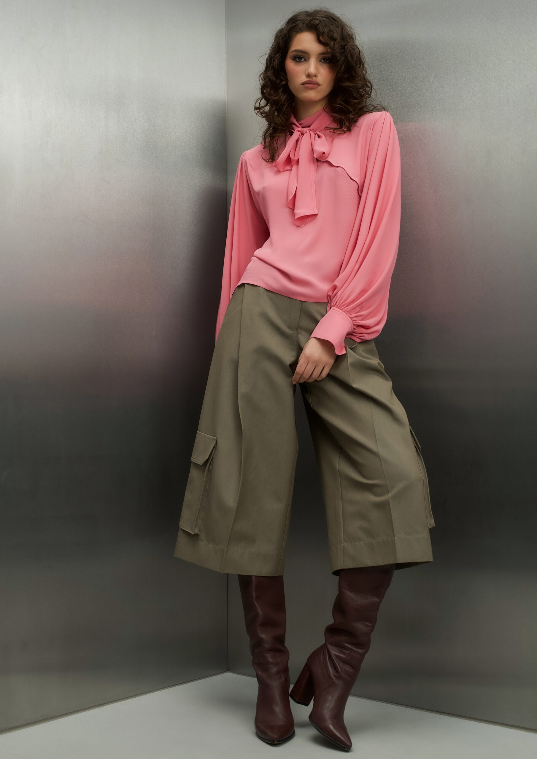 Stylish wide-leg capri pants in army khaki. Featuring side flap pockets and a clean, structured design — perfect for a modern casual look.